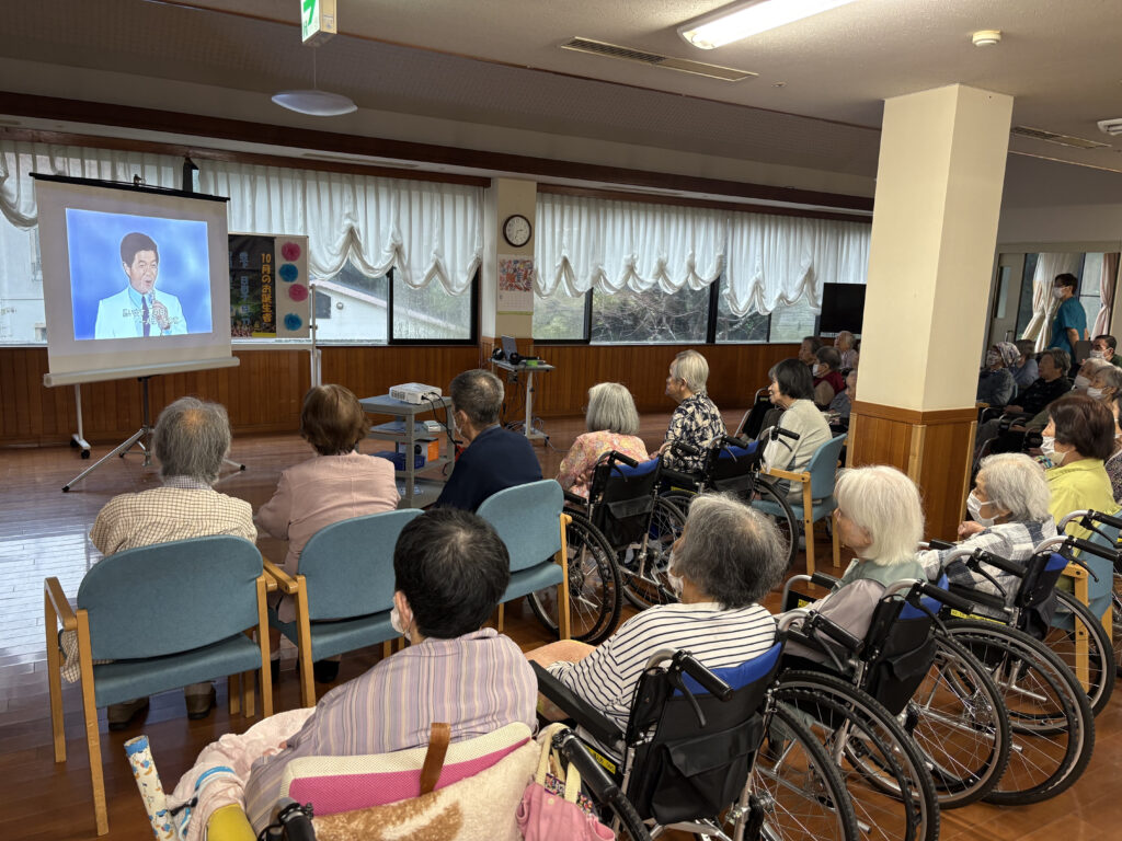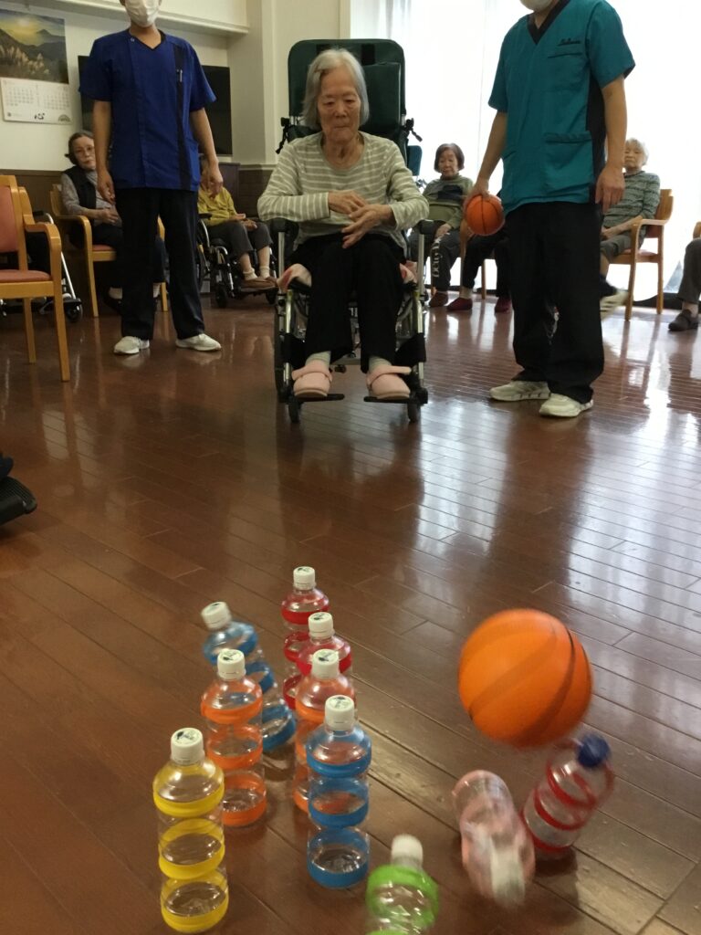 10月の行事は、昭和歌謡曲の映像を鑑賞しました。懐かしそうにされ、一緒に口ずさんでいる入居者様もいらっしゃいました。ボーリングでは、ボールを力強く投げて倒していました。笑いや拍手が飛び交い、皆様楽しそうでした。