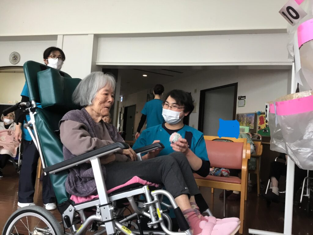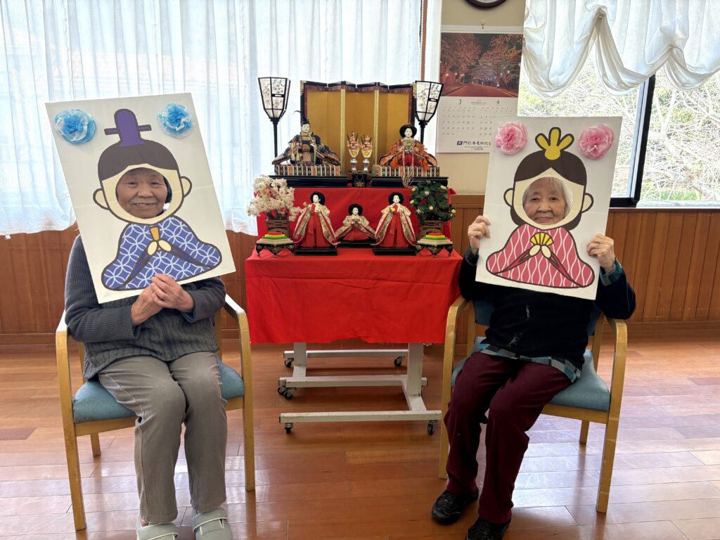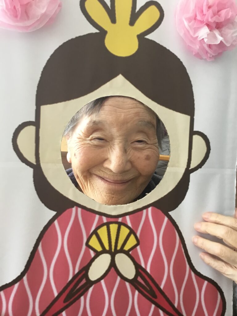 松和園では、ひな祭りにちなんで利用者様と職員でお内裏様やお雛様になって写真撮影を行いました。皆さんお似合いで素敵な笑顔の写真がたくさん撮れました!また、ひな祭り特製の玉入れを行いました。壁に付けた袋に球を投げて入れるのですが、なかなか難しく皆さま真剣に玉を入れていました。うまく入った時の笑顔が最高でした。